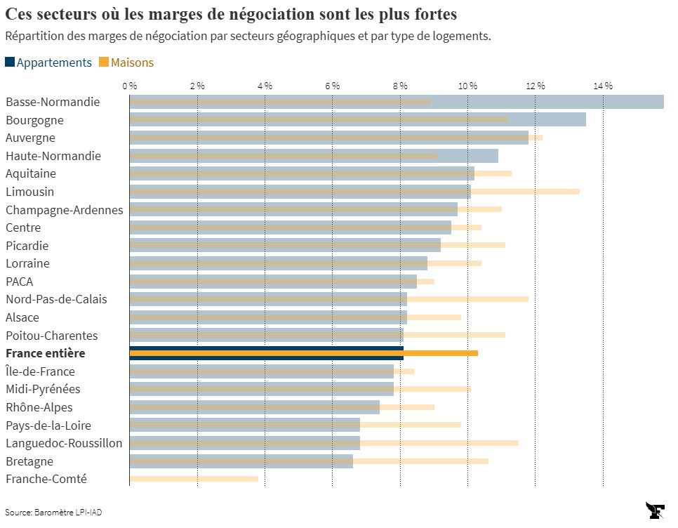 Si les discussions sont sensiblement plus importantes sur les maisons (10,1% en moyenne) que sur les appartements (8,3%), les régions font désormais le grand écart. En Basse-Normandie, les appartements partent avec une énorme ristourne de 15,8% quand il faut se contenter d’un «petit» 6,6% en Bretagne. Et côté maisons, c’est dans le Limousin que les négociations sont les plus âpres (13,3% de marges de négociation moyennes) alors qu’en Franche-Comté les acheteurs ont le moins de poids et ne décrochent que des rabais moyens de 3,8%.